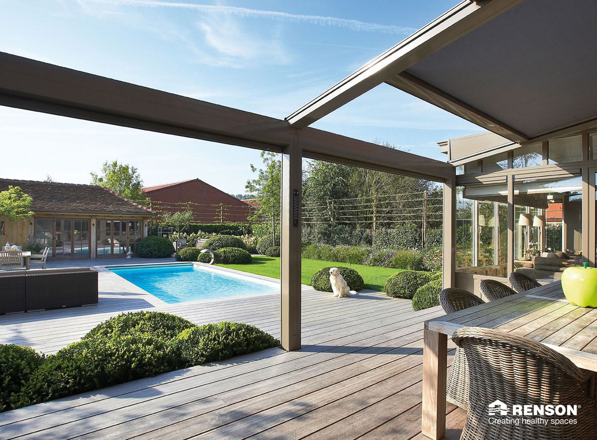Une pergola en store est montée sur une façade et possède un store résistant au vent, étanche et translucide en toiture. Vous êtes protégés du vent et de la pluie. En position ouverte vous conservez une vue panoramique.